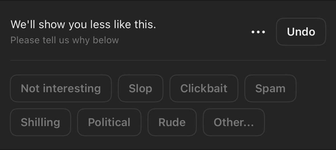 Some might say “Kevin just scroll past them, it’s fine every platform has bots and spammers.” No. I want heads on pikes and my feeds purified.1 I need more people to be aware of and use this button in generous amounts. I need to overcorrect with some draconian id verification so I don’t lose hair over illusions.