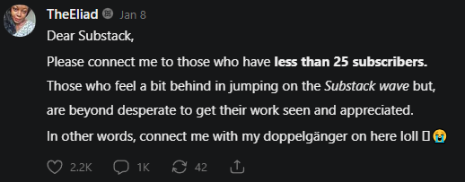 It’s also possible that Substack may actually be a better platform than we give it credit for, and it just takes time to figure out the moderation and personalization tools to separate the wheat from the chaff. This could be an exceptionally bad time of year due to an influx of low quality New Year’s Resolutioners. Perhaps this plague is a sort of blessing in disguise, an opportunity for those of flesh and blood inclinations capable of the friction and spirit necessary to produce real art and insight.