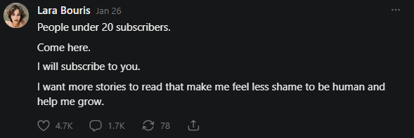 I get what it’s like to post something new, to feel like you have something worth contributing, seeking praise and judgement. It’s cool to be on a platform that respects writing, and to be surrounded by a bunch of internet strangers where you can see if they value anyone enough to pay to read. There’s so much talent and perspective here that you’d honestly be foolish to not cast a line in the pool. But why do some of you have to be so vapid?